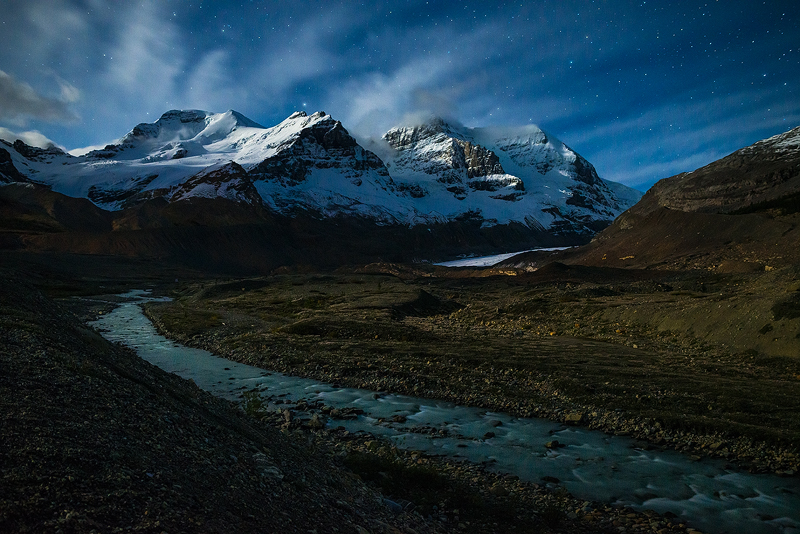 A gorgeous nighttime view of the Sunwapta River as it comes off Sunwapta Lake in front of the Athabasca glacier.